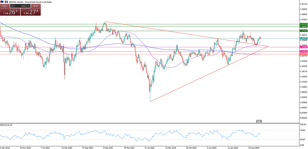GBP/USD has broken higher from a symmetrical triangle formation, reaching a multi-year high at 1.3790 before pulling back to test trendline support near 1.30. The successful hold above this level allowed the pair to recover and stabilise.