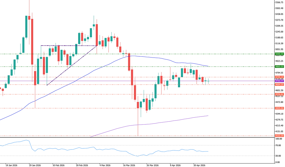Technically, gold is struggling below $4850 resistance, with immediate support at $4660 and $4550 as the key downside support. Momentum indicators remain neutral, showing no clear directional bias.