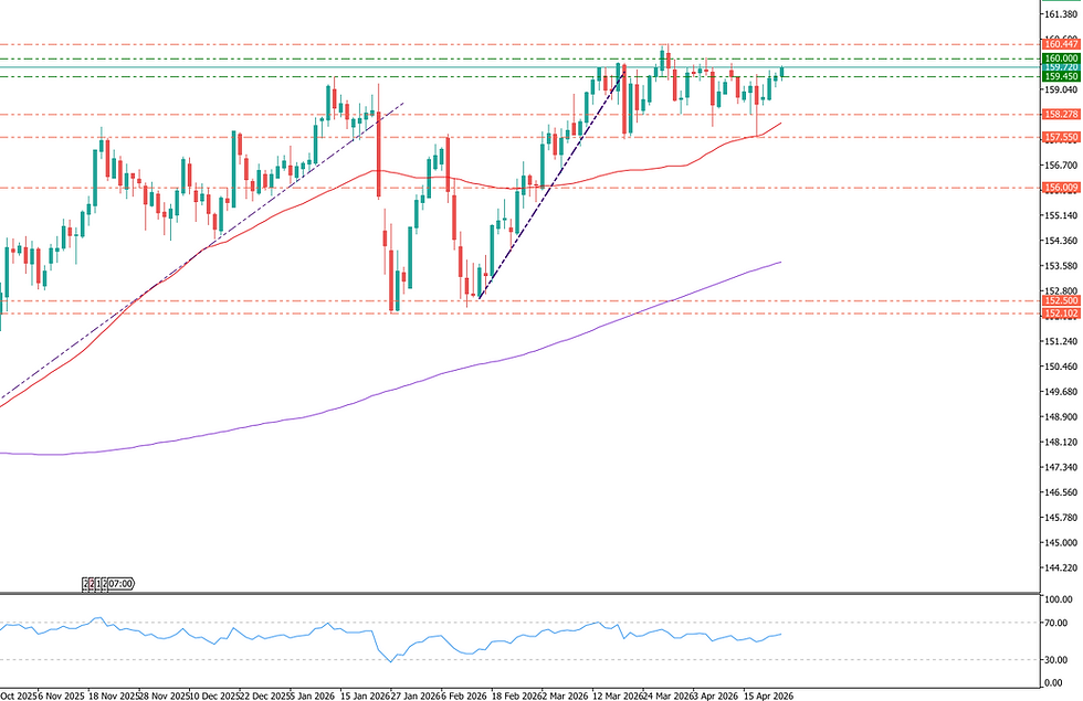 However, the market remains headline-driven. If oil prices fall or geopolitical tensions ease, the pair could drop back below 159.30, opening the door for a move toward the 50-day moving average near 158.